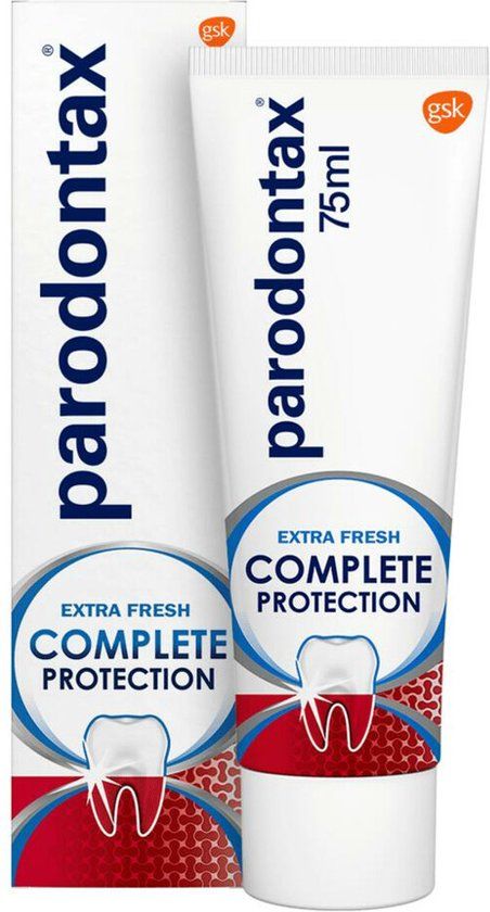 Parodontax Complete Protection Extra Fresh tandpasta heeft 8 voordelen voor gezond tandvlees & sterke tanden. Het gaat daarmee verder waar een gewone tandpasta stopt. Deze tandpasta is 4x effectiever in het verwijderen van tandplak* en helpt jou daarbij met het volgende: Gezond tandvlees, voorkomt slechte adem, houdt de aansluiting tussen tanden en tandvlees in stand. Daarnaast zorgt Complete Protection tandpasta voor een diepe reiniging tussen de tanden en maakt schoon voor een fris gevoel. Parodontax Complete Protection tandpasta zorgt met fluoride voor sterker tandglazuur.
