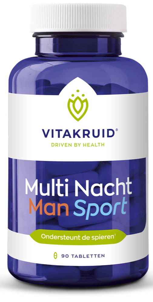 Vitakruid Multi Nacht Man Sport Tabletten (90 stuks) zijn een voedingssupplement speciaal ontwikkeld voor actieve mannen en bieden een unieke combinatie van essentiële vitaminen, mineralen en kruiden om uw lichaam te ondersteunen na inspanning.Vitakruid Multi Nacht Vrouw Man Tabletten:Bevatten vitamine D voor sterke spieren en botten, met een dosering van 20 mcg per tabletZink en selenium, essentieel voor de productie en beweeglijkheid van zaadcellen, ondersteunen tevens het immuunsysteem en normale haargroeiGember bevordert een normale maag- en darmwerking* (ideaal voor sporters met een eiwitrijk dieet)Passiebloemextract draagt bij aan ontspanning en bevordert slaapbereidheid voor een goede nachtrust**Gezondheidsclaims in afwachting van Europese goedkeuringDoseringNeem dagelijks 1 tablet van de Vitakruid Multi Nacht Vrouw Man Tabletten in, bij voorkeur 2 uur voor het slapen gaan. Raadpleeg uw arts voordat u nieuwe supplementen toevoegt aan uw dieet, vooral als u al medicatie gebruikt of gezondheidsproblemen heeft. Aanbevolen dosering niet overschrijden.