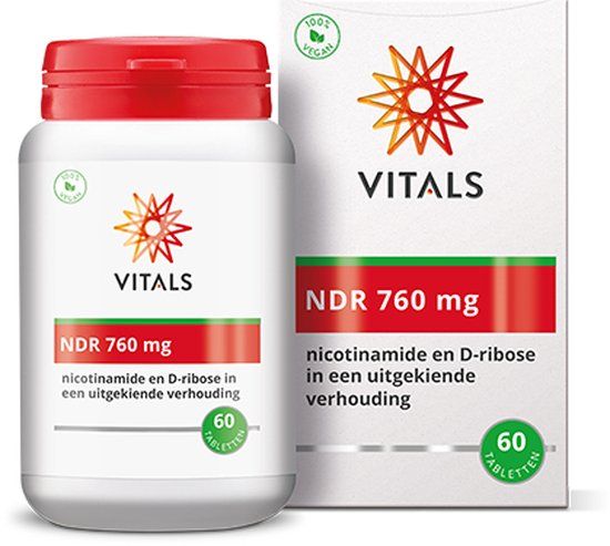 NDR 760 mg van Vitals bevat RiaGev-SR® van de Amerikaanse producent Bioenergy Life Science. ‘NDR’ staat voor Nicotinamide en D-Ribose. De tablet met vertraagde afgifte (SR = Slow Release) bevat vitamine B3 en D-ribose in een gepatenteerde verhouding. D-ribose is een enkelvoudige suiker (monosacharide) die (ook) in het lichaam aangemaakt kan worden uit glucose. D-ribose maakt samen met nicotinamide deel uit van NAD. Ook moleculen als DNA en ATP bevatten D-ribose. Het komt zodoende in elke lichaamscel voor. Bioenergy Life Science heeft