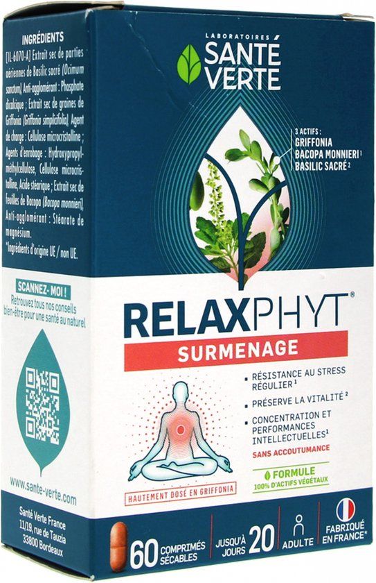 Santé Verte RelaxPhyt Overwerk 60 Tabletten is een voedingssupplement op basis van : heilige basilicum, bekend om zijn vele deugden, die helpt vitaliteit te behouden, stress te weerstaan en de hartfunctie te ondersteunen,bacopa monnieri, dat helpt bij het verlichten en voorkomen van stress en bij het behouden van een goede concentratie en intellectuele prestaties,griffonia, waarvan de zaden 30% 5-HTP bevatten, een aminozuur dat een voorloper is van het "gelukshormoon" serotonine.Niet verslavend. Gemaakt in Frankrijk.