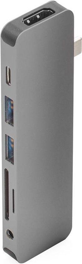 - Allow USB-C MacBook, PC and devices to work with popular legacy connections\n- Turns a single USB-C port into 7 ports (HDMI, USB-C with Power Delivery, 2 x USB 3.1, microSD, SD, audio jack)\n- Connect USB-C MacBook, PC and devices to HDMI displays, up to 4K video resolution\n- Slim and compact. Sits flush with the 12" MacBook and 13"/15" MacBook Pro\n- Precision milled aluminum enclosure, available in Space Gray and Silver, with the same color and appearance as the MacBook and MacBook Pro\n- Using MacBook Pro? Check out HyperDrive Hub for USB-C MacBook Pro