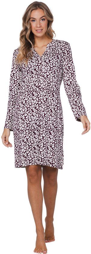 Het nachthemd is bordeaux van kleur met een all-over animal print in beige. Het nachthemd heeft lange mouwen, een ronde halslijn die uitloopt in een v met een knoopsluiting.
