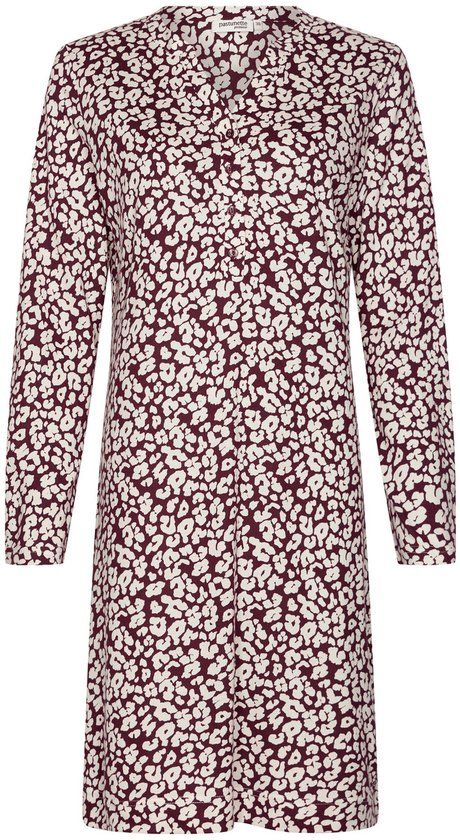 Het nachthemd is bordeaux van kleur met een all-over animal print in beige. Het nachthemd heeft lange mouwen, een ronde halslijn die uitloopt in een v met een knoopsluiting.