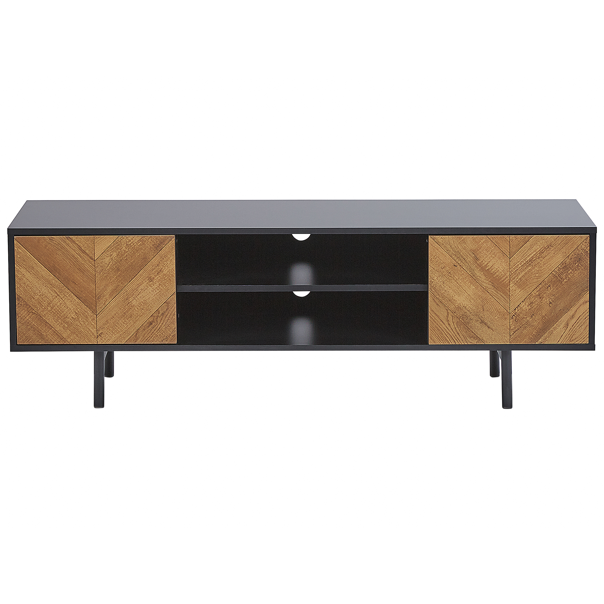 Prachtig tv-meubel als opbergwonder. Deze tv-standaard is een elegante toevoeging aan elke woonruimte en helpt je bij het organiseren van je opbergruimte. Met zijn open en gesloten compartimenten creëert hij voldoende ruimte voor elektronische apparaten, dvd's en andere praktische snuisterijen. Aan de achterkant zitten twee opbergvakken waar je alle kabels doorheen kunt trekken. Op de voorkant is een mooi visgraatpatroon aangebracht, wat elke kamer een rustieke charme geeft en het stuk nog aantrekkelijker maakt.Details: Producttype: TV-kast Stijl: Rustiek Kleur: Lichte houtkleur Soort materiaal: Bewerkt hout Hoofdmateriaal: Vezelplaat Overig materiaal: Metaal Material poten: Metaal Materiaal bovenkant: Bewerkt hout Aantal planken: 2 Opening deur: Horizontaal (standaard) Afwerking: Gefineerd Aantal deuren: 2