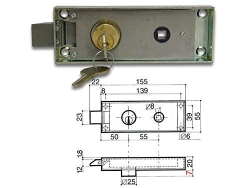 Voor bevestiging aan ijzeren deuren Bedienbare sleutelhanger met handgreep, klemsluiting van binnen en buiten Vierkante handgreep 8 mm, rechthoekige schacht, cilinder van messing met pennen diameter 25 mm, uitsteekcilinder van draaddoos mm. 38 NL Voor deuren met scharnieren rechts (buitenkant) met treksluiting van buitenaf 2 vernikkelde messing sleutels meegeleverd, Fabrikant: Prefer Srl