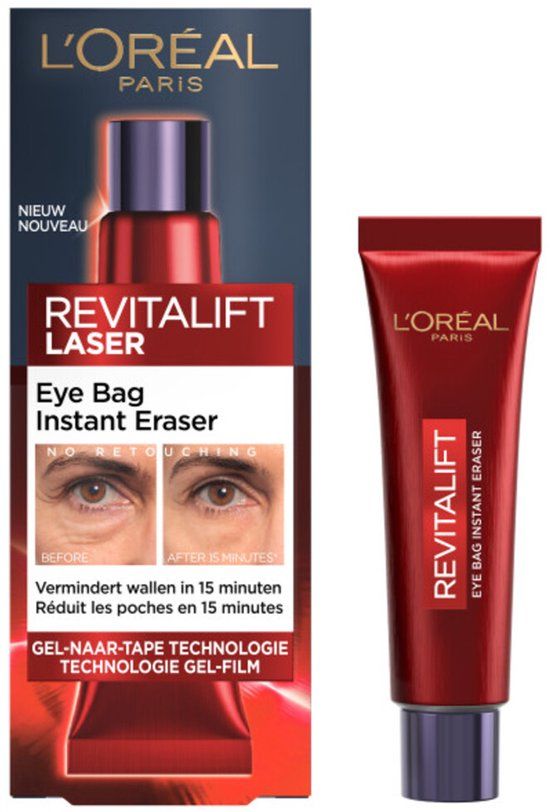 L'Oréal Paris Revitalift Laser Instant Eye Bag Eraser zorgt voor onmiddelijke vermindering van lijntjes en rimpels, wallen en zwelling, verlies van stevigheid en ruwe kreukelige huid rondom de ogen. L'Oréal Paris Revitalift Laser Instant Eye Bag Eraser zorgt voor een dramatisch straktrekkend, ontzwellend en gladmakend effect, waardoor hardnekkige wallen de hele dag door zichtbaar verminderen. Dankzij de revolutionaire gel-naar-tape technologie. De L'Oréal Paris Revitalift Laser Instant Eye Bag Eraser transformeert in een onzichtbaar laagje dat gezichtsbewegingen weerstaat en comfortabel aanvoelt. Ervaar het verschil in slechts 15 minuten*. Geschikt voor alle huidtypen. Oftalmologisch getest. Lees voor gebruik goed de gebruiksaanwijzing.