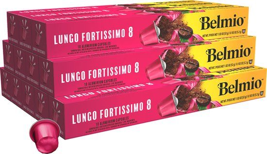 De Belmio Lungo Forte is een uitgesproken karaktervolle koffie die je in een handomdraai kunt bereiden met deze koffiecapsules. Deze koffiecapsules, geïntroduceerd in 2021, zijn compatibel met een breed scala aan machines, waardoor je gemakkelijk thuis of op het werk van jouw koffie kunt genieten. De inhoud is genoeg voor 10 kopjes, en met de roze verpakking kan je deze capsules herkennen te midden van die van andere koffiemerken. Opgemerkt moet worden dat ze worden geleverd in een duurzame kartonnen doos, die makkelijk te recyclen is. De rijke en krachtige smaak van de Lungo Forte zal zeker in de smaak vallen als je de voorkeur geeft aan een sterke koffie. Dus als je op zoek bent naar een gemakkelijke manier om thuis te genieten van uitstekende koffie, dan zijn deze Belmio Lungo Forte koffiecapsules absoluut het overwegen waard.