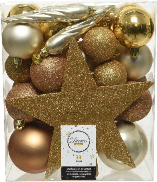 33x stuks kunststof kerstballen met ster piek goud/parel/camel bruin. Pakket met onbreekbare kerstballen en een sterren piek. De set bevat glanzende, matte en glitter kerstballen en ijspegels. Onze kerstballen worden standaard geleverd met ophangdraadjes maar wij adviseren u om onze kerstbalhaakjes mee te bestellen niet inbegrepen. Materiaal: kunststof/plastic. Formaat diameter: 5, 6 en 8 cm.