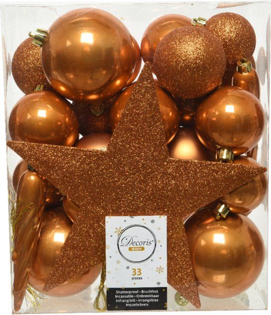 33x stuks kunststof kerstballen met ster piek cognac bruin (amber). Pakket met onbreekbare kerstballen en een sterren piek. De set bevat glanzende, matte en glitter kerstballen en ijspegels. Onze kerstballen worden standaard geleverd met ophangdraadjes maar wij adviseren u om onze kerstbalhaakjes mee te bestellen (niet inbegrepen). Materiaal: kunststof/plastic. Formaat diameter: 5, 6 en 8 cm.