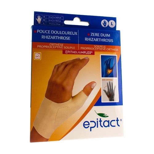 Epitact Soepele Duimorthese Rechts Large (1 stuk; Millet Innovation; Epitact®) Deze soepele orthese werd ontwikkeld om gewrichtspijn door rhizartrose of artrose van de duim te verlichten. Ze maakt het mogelijk om de dagelijkse gebaren te maken terwijl traumatiserende microbewegingen worden beperkt. Overdag te dragen, zonder mate… Het overdag dragen van de Soepele Proprioceptieve Orthese Duim Epitact® helpt gewrichtspijn door artrose aan de basis van de duim (rhizarthrose) te verlichten. Ze beperkt traumatiserende microbewegingen (verplaatsen van de handen in de ruimte tijdens het wandelen, praten, …), houdt de duim in rusthouding en bewaart de lokale warmte ter hoogte van het gewricht. Deze soepele en dunne orthese zorgt ervoor dat u de volledige functie van uw hand kunt behouden: u kunt met de wagen rijden, schrijven, uw telefoon gebruiken, … en uw horloge of uw juwelen dragen!