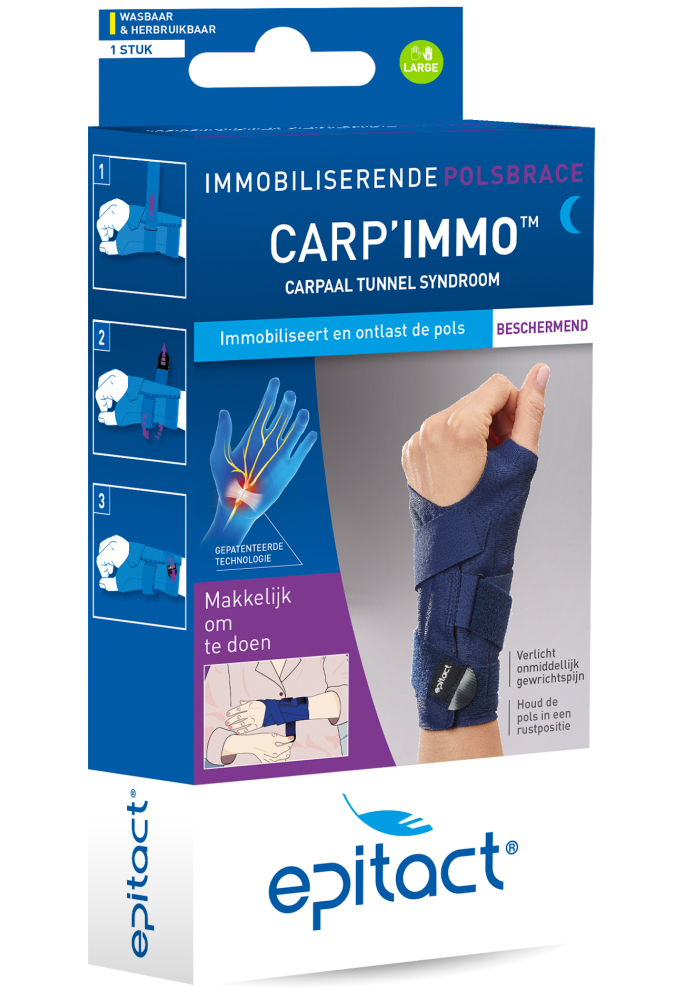 Epitact Carp'Immo Rechts Maat L is een soepele polsbrace die u kunt gebruiken bij Carpaal tunnel syndroom (CPS), spier-en skeletaandoeningen, ontstekingen of tendinitis van de pols. Het regelmatig dragen van de Carp'Immo rustorthese is aanbevolen tijdens de nacht of in alle situaties waarin u uw hand niet gebruikt. Deze zeer lichte Epitact polsbrace past zich aan aan uw pols en houdt deze in een neutrale positie dankzij de semi-rigide anatomische versterkingen. De lichte, fijne brace biedt optimale comfort, opent wijd om het doorlaten van de hand te vergemakkelijken en beschikt tevens over een riempje voor een soepele pasvorm van de brace rond de pols. De Epitact Carp'Immo Rechts Maat L kan gewassen worden en is meerdere maanden te gebruiken.Epitact Carp'Immo Rechts Maat L:Te gebruiken bij Carpaal tunnel syndroomOok bij spier-en skeletaandoeningen en peesontstekingenEen lichte, soepele en comfortabele polsbraceBiedt comfort en ondersteuningVrije beweging van de vingers, fixatie van de polsWasbaar en meerdere maanden te gebruikenMaattabel:BracemaatHandomtrekSmall (S)17.0 – 19 cmMedium (M)19.0 – 21.5 cmLarge (L)21.5 – 24.0 cmHoe te gebruiken?Gebruik 's nachts of in situaties waarin u uw hand niet gebruikt. Wasbaar in de wasmachine op 30 graden, niet strijken of stomen en niet in de droger.