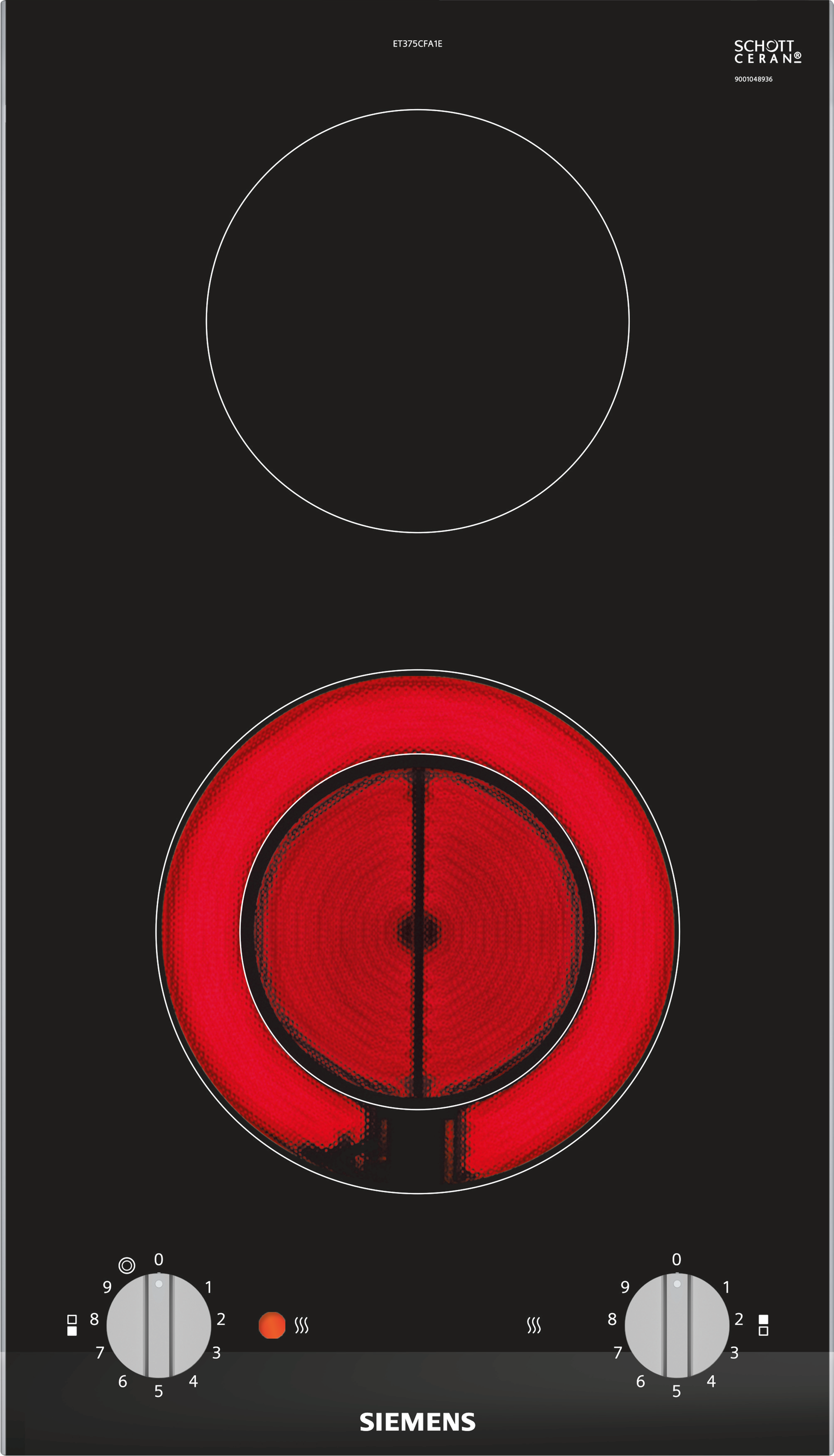 De bediening van de Siemens ET375CFA1E is uiterst gebruiksvriendelijk dankzij de twee draaiknoppen. Hiermee kan het vermogen van de kookzones nauwkeurig worden ingesteld, met negen verschillende vermogensstanden om uit te kiezen die specifiek kunnen worden afgestemd op de kookbehoeften van elk gerecht. Deze kookplaat is uitgerust met een restwarmte-aanduiding, een belangrijke veiligheidsfunctie die aangeeft of de kookzones nog warm zijn.