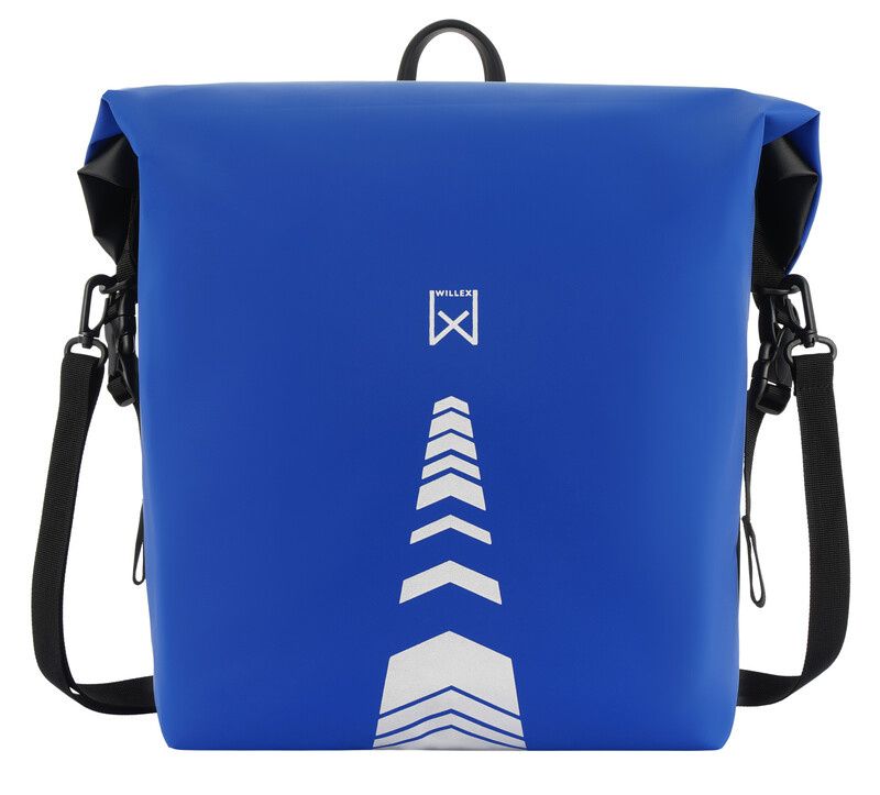 Een sportieve enkele fietstas van Willex met een inhoud van 17 liter. De blauwe tas is waterdicht, met een waterproof vouwsluiting, reflectie, een afneembare schouderband en verstelbare bevestigingshaken.