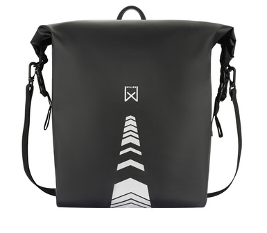 Een sportieve enkele fietstas van Willex met een inhoud van 17 liter. De zwarte tas is waterdicht, met een waterproof vouwsluiting, reflectie, een afneembare schouderband en verstelbare bevestigingshaken.