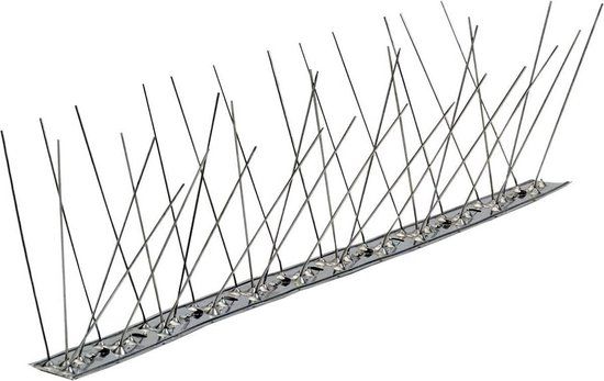 Duivenpinnen op RVS strip voor plaatsen met VEEL vogeloverlast. Te gebruiken op plaatsen waar duiven overdag en 's nachts verblijven. Ook te gebruiken tegen nestvorming. Naast pinnen die dwars op de strip staan, staan er ook in de lengterichting pinnen, zodat duiven de eerste pinnen niet naar buiten kunnen drukken en alsnog een nest kunnen maken. RVS strips zijn duurzamer dan polyster/kunststof strips en staan garant voor vele jaren effectieve duivenwering.