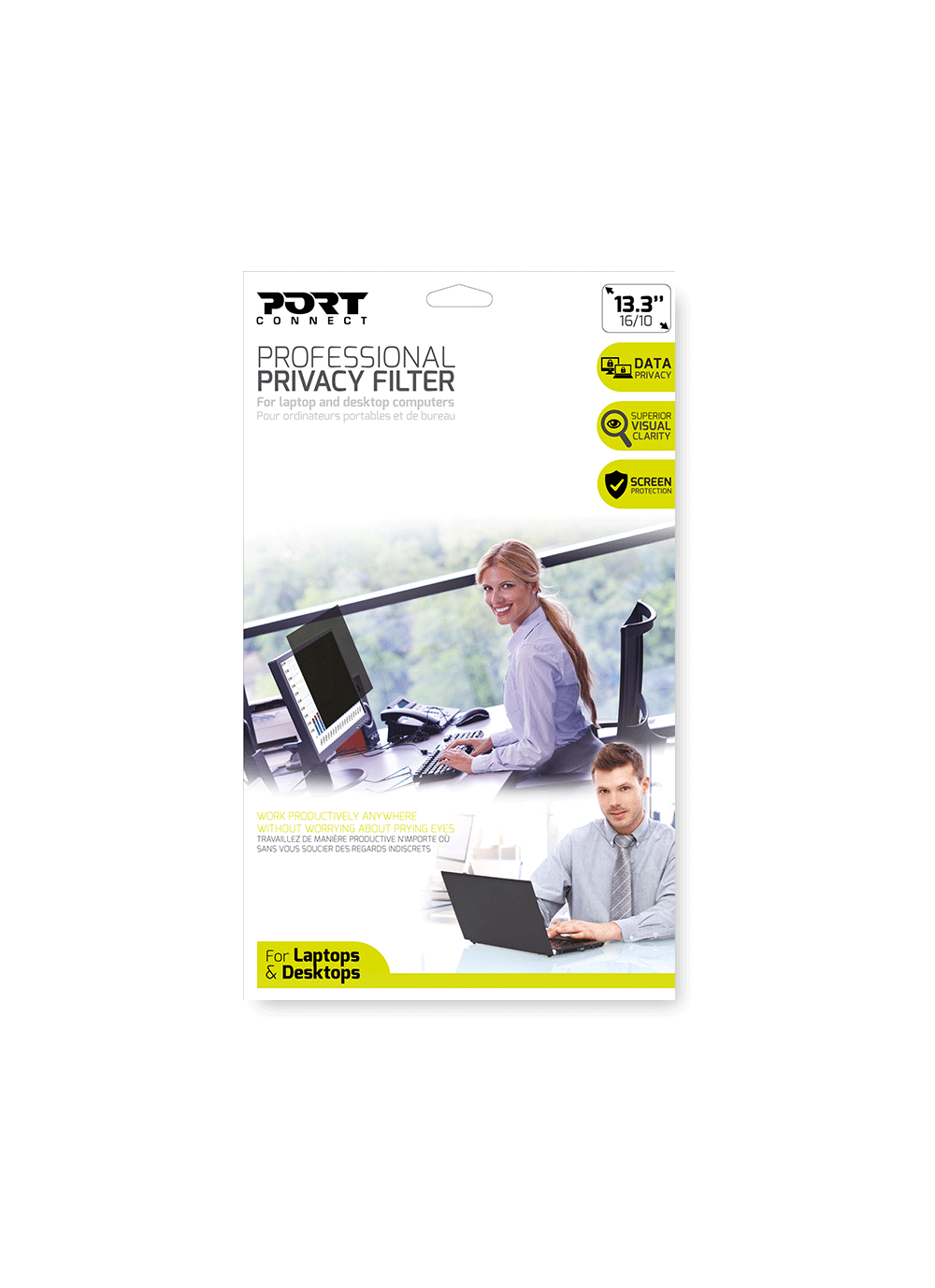 PORT Professional Privacy filters are designed to preserve the confidentiality of the information displayed on a computer screen. Once positioned, only the user located in front of the screen is able to view the information and anyone located laterally at more than a 30 ° angle from the screen will see anything other than the black opaque filter. Perfectly adapted to mobility, it ensures the confidentiality of computer screens especially at work and during travel: ideal for offices, open spaces, airports, airplanes, trains, cafes and other public places. Work productively anywhere without worrying about prying eyes. Very simple to install, it can be removed and repositioned to infinity in a moment to share your screen with others. Thin and durable, the filter also provides protection for the screen against scratches, dirt and shocks.