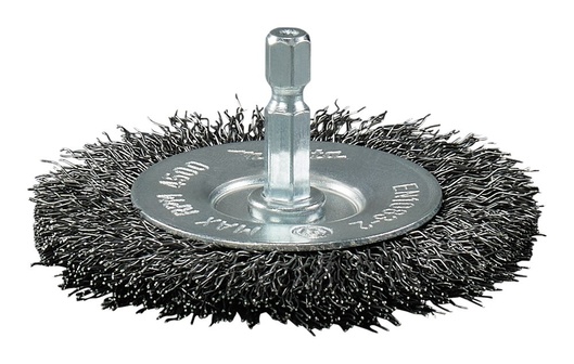 Makita rondborstel 75mm met 1/4" vorm E aansluiting. Deze rondborstel heeft geplooid staaldraad en is uitstekend geschikt voor het reinigen en verwijderen van verf, roest, aanslag en schilfers, of voor het ontbramen van ijzer of staal.
