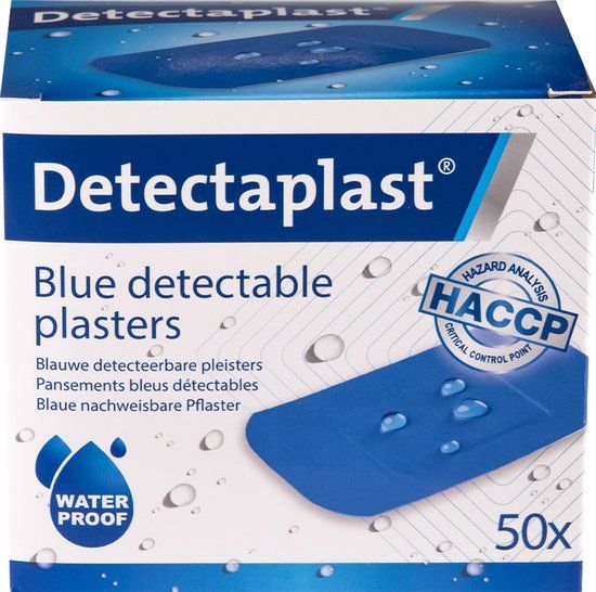 - METAALDETECTEERBAAR Dankzij haar blauwe kleur en aluminium strip, zijn de pleister visueel en elektromagnetisch detecteerbaar. Op deze manier kunnen ze snel uit het productieproces gehaald worden wanneer nodig.