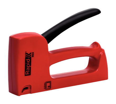 Rapid R53E Staple Gun\nLight, easy to handle staple gun for DIY and home projects or easier professional jobs. Made in tough, robust plastic, craftsmen appreciate features such as high performance, light weight, long working life and its ability to cope with regular use. The R53E is also suitable for users with smaller hands. Ideal for furniture upholstery, decorative work with diverse textile types or fastening of quilts, posters or leather.\n\n- For finewire staple No. 53, 4-10 mm\n- All-steel wear parts inside\n- Ergonomic handle with lock function for easy storage\n- Made in Sweden