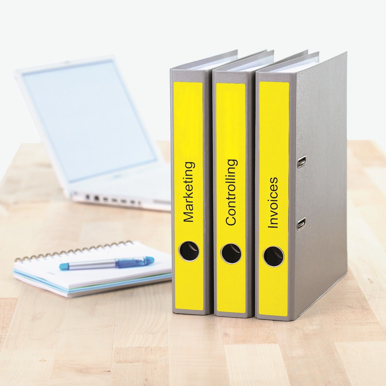 - File spine labels on A4 sheets, self-adhesive\n- For a uniform appearance at the office and at home\n- For all standard files\n- Fully opaque material with high whiteness, old lettering does not show through\n- Blank: ideal for company logos, inscriptions and organization notes\n- Reliable adhesion, even with frequently used files\n- Environmentally friendly: high-quality, chlorine-free bleached special paper, PEFC-certified, solvent-free adhesive\n- Labels are 100% recyclable, dispose of as for waste paper, packaging made from recycled cardboard\n- Excellent printing results on all laser printers, inkjet printers, copiers, colour laser printers and colour copiers\n- Trouble-free processing thanks to all-round protective edge and optimum flatness\n- Free software solutions