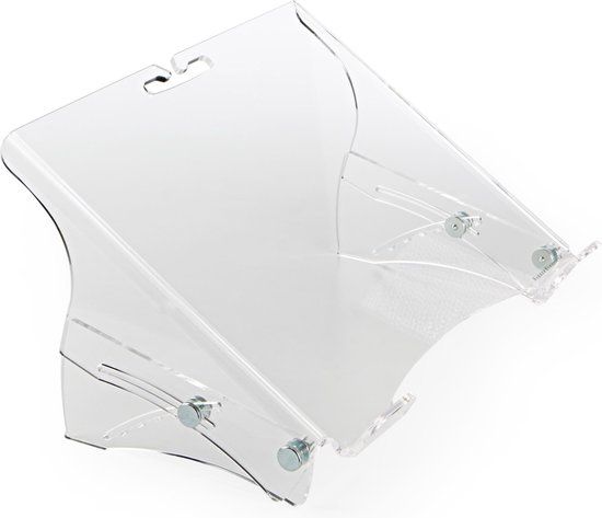 - 7 standen: hoogtebereik van 11 tot 23 cm\n- Transparant: helder acrylaat design\n- Geschikt: ook voor 17'' laptops\n- Kabelmanagement: klip aan de achterzijde\n- Materiaal: glashelder recycleerbaar 5 mm acrylaat
