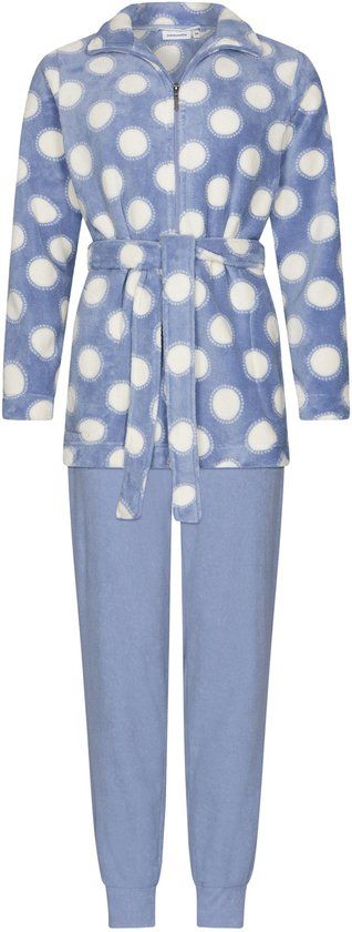 De top is blauw van kleur met een stippen dessin in sneeuwwit. De top heeft een ritssluiting, lange mouwen en twee zakken aan de voorkant. Leuk detail is de ceintuur in de taille. De broek is uni blauw van kleur en heeft een elastische tailleband voor een optimale en comfortabele pasvorm. Verder heeft de broek praktische steekzakken.