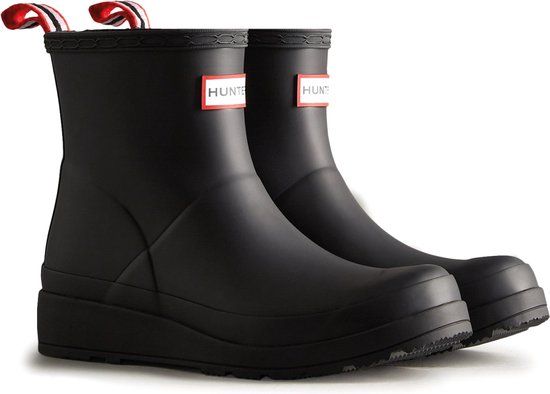 Met deze mooie korte regenlaarsjes van het merk Hunter heb jij gegarandeerd droge voeten wanneer je een regendansje doet! Dit model Play Boot Short heeft een zwart rubberen buitenkant met het merklogo aan de voorkant van de schacht en een handige aant