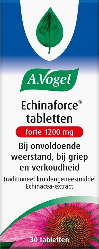 Griep, verkoudheid? Echinaforce tabletten is een Traditioneel Kruidengeneesmiddel dat helpt bij onvoldoende weerstand, tegen griep en verkoudheid. Echinaforce wordt gemaakt van rode zonnehoed (Echinacea purpurea). Deze geneeskrachtige plant stimuleert de activiteit van het immuunsysteem, waardoor de weerstand tegen bacteriële en virale infecties toeneemt. Hierdoor wordt u minder snel ziek en herstelt u sneller in geval van ziekte. \n\nDe bijzondere eigenschappen voor u op een rij:\n- Verhoogt de weerstand tegen bacteriële en virale infecties\n- Verkleint de kans op griep en verkoudheid\n- Versnelt herstel\n- Met bewezen effectieve ingrediënten\n- Werkt krachtig en natuurlijk\n\nGriep en verkoudheid, hoe te herkennen\nGriep is een infectieziekte, die wordt veroorzaakt door het zogenaamde influenza-virus. Een dag tot anderhalve dag na besmetting met het virus worden de eerste symptomen merkbaar.\n\nGriep komt vaak onverwachts en heel snel opzetten, je voelt je binnen enkele uren erg beroerd en ziek worden. Daarbij zijn de meest voorkomende kenmerken van een griep:\n\n- vermoeidheid\n- hoofdpijn\n- rillerig en het koud hebben\n- koorts\n- misselijkheid\n- spierpijn\n- keelpijn\n- loopneus\n- zich 'lamlendig' voelen\n\nHet afweersysteem van het lichaam wordt bij de strijd tegen het griepvirus zwaar belast. Dit kan een bijkomende besmetting door bijvoorbeeld bacteriën tot gevolg hebben. De klachten kunnen dan verergeren. Voor gezonde volwassenen en kinderen is het krijgen van griep meestal niet ernstig.\n\nHet griepvirus is zeer besmettelijk en wordt vaak overgebracht door besmette vloeistofdeeltjes in de lucht. Door bijvoorbeeld hoesten wordt het virus verspreid, maar ook door een besmet persoon een hand geven.\n\nVerkoudheid: symptomen\nNet zoals dat griep wordt veroorzaakt wordt door een virus, wordt een echte verkoudheid dat ook: het is een infectie van het neusslijmvlies of het slijmvlies in de mond- en keelholte. Veel voorkomende klachten bij een verkoudheid zijn:\n\n- loopneus\n- droge, soms pijnlijke keel\n- niezen\n- tranende ogen\n- hoofdpijn