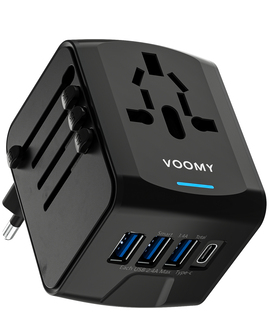 De Voomy universele wereldstekker geeft wereldwijd toegang tot stroom door de gemakkelijk uitklapbare stekkers voor verschillende landen. Zo heeft u toegang tot stroom in onder andere: Engeland (UK), Amerika (USA), Australië (AU), Azie (AS), Zuid Amerika en Europa (EU). U kunt verschillende apparaten aansluiten op de stekker en bijvoorbeeld uw telefoon opladen met de 4 usb poorten, waarvan 3x USB-A en 1x USB-C.