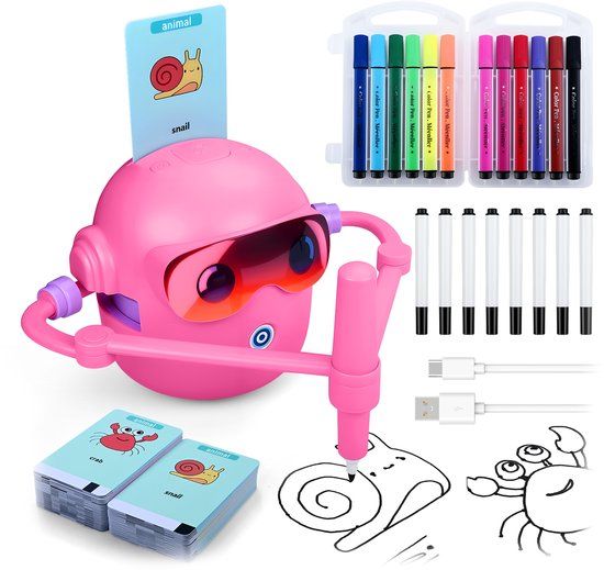 De tekenrobot begeleidt je kind door 100 tekenkaarten vol met dieren, voertuigen, eten en meer, waardoor leren eenvoudig en leuk wordt. Er zijn geen apps nodig. Kinderen kunnen deze tekenrobot zelfstandig bedienen door hem simpelweg aan te zetten, de pen te bevestigen, een tekenkaart te plaatsen en op de tekenknop te drukken. De robot geeft stap-voor-stap begeleiding in combinatie met een vrolijk liedje, voor urenlang creatief speel- en leerplezier.