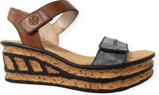 Trendy Rieker sandaal voor dames. De kleurencombinatie van blauw en bruin is heel mooi. De platformzool maakt de schoen helemaal af. Deze sandaal heeft een zacht en voorgevormd voetbed.De sandaal sluit je met klittenband.De sandaal is gemaakt van leer.