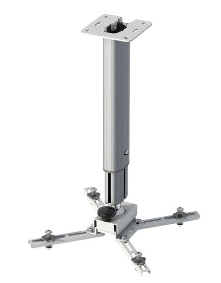 High-quality ceiling mount for data-video-projectors, RAL 9003 white, distance to ceiling 41 - 61 cm, can hold up to 25 kg, with aluminium joint.\n\n- Newly developed anodized aluminium profile with fully covered interior cable channel.\n- Pre-assembled for quick mounting.\n- Stepless telescopic height adjustment.\n- Can hold up to max. 25 kg.\n- Aluminium ball-point joint with quick change system - for tilting the projector ± 20° in all directions, rotates ± 180°.\n- Custom-made versions possible on demand, up to 300 cm column length.\n- Fixing points 138 - 378 mm.\n- TÜV/GS certified.\n\nScope of delivery: Screw set for projector mounts, M3, M4, M5, M6 incl. height-adjustable distance elements.