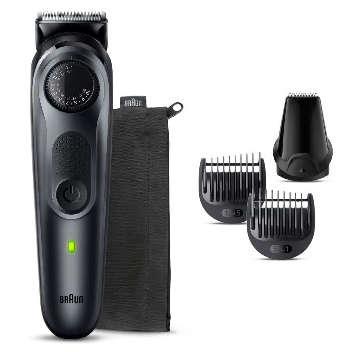 De Braun BeardTrimmer 5 BT5450 is de ideaal voor mannen die hun baard met precisie willen trimmen. Deze efficiënte en veelzijdige baardtrimmer is voorzien van een roterend scheerapparaat en heeft een trim- en tondeusefunctie. Met een keuze uit zes stappen voor de baardlengte, is het mogelijk om de gewenste look te bereiken, of het nu een stoppelbaard of een volle baard is. Bovendien heeft deze trimmer een laagste snijstand van 0,5 mm. De trimmer is veelzijdig te gebruiken dankzij de opzetstukken voor verschillende stijlen. De baarddichtheid kan eenvoudig worden aangepast via de handige draaiknop, wat het trimmen nog comfortabeler maakt. Een speciale haaropvangkamer zorgt voor een schone trimbeurt, waarbij losse haartjes worden verzameld. Na gebruik is de trimmer eenvoudig schoon te maken, omdat deze wasbaar is. De BT5450 werkt op een oplaadbare lithium-ion batterij, die na volledig opladen een gebruiksduur van 100 minuten biedt. Dit compacte apparaat verrast met zijn zwarte, strakke design en biedt alle essentiële functies die je van een baardtrimmer mag verwachten, zonder overbodige details zoals een ingebouwd display. Dit product combineert functionaliteit en gebruiksgemak; perfect voor de moderne man.