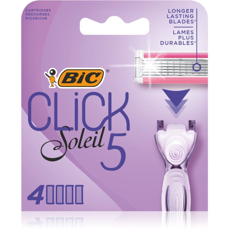 BIC Soleil Click 5, 4 st, Scheermesjes voor Vrouwen , Vervangende mesjes BIC Soleil Click 5 en de regelmatige vervanging garanderen een gelijkmatig glad gezicht, net zoals bij het scheren met een nieuw scheerapparaat. Kenmerken: gemakkelijk te vervangen scheerkoppen de mesjes zorgen voor een gladde scheerbeurt Geïntegreerde hydraterende stroken geven verzorgende stoffen vrij Hoe te gebruiken: Vervang de scheerkop door een nieuw kop zodra de mesjes versleten raken of bot worden.