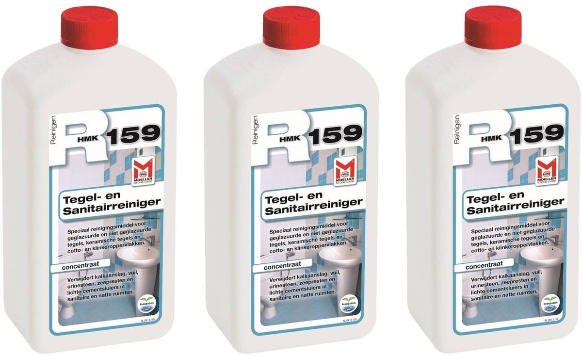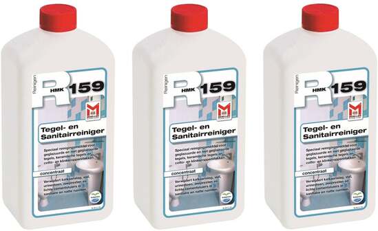 HMK R159 tegel- en sanitairreiniger Voordeelverpakking 3 stuks Met deze HMK R159 tegel- en sanitairreiniger worden je tegels en sanitair mooi schoon. Het is een speciaal ontwikkeld reinigingsmiddel dat kalkaanslag, vuil, zeepresten van geglazuurde- en ongeglazuurde wand- en vloertegels, chroom, rvs, glas, enkele kunststoffen en aluminium in sanitaire ruimtes verwijderd. Zo worden bijvoorbeeld je sterk vervuilde voegen in de badkamer weer als nieuw en al je tegels en sanitair weer glanzend schoon.Belangrijkste kenmerken: * Inhoud: 3x 1 liter * GebruiksklaarGebruiksaanwijzing Wanneer je dit middel gebruikt voor het dagelijks onderhoud verdun dan het middel met water, 1:100. Bij vervuiling kun je de verhouding 1:10 of 1:5 gebruiken. Laat het middel een korte tijd inwerken en werk het daarna met een zachte schuurspons licht op en spoel het met schoon water na. Pas op: zuurgevoelige oppervlakken, zoals eloxal, diverse kunststoffen, emaille, marmer, travertin, niet behandelen met deze schoonmaakreiniger. Weet je niet zeker of een van deze materialen betreft, test dan het middel eerst op een onopvallende plek. Het middel ook buiten het bereik van kinderen houden. Daarnaast is dit middel irriterend voor ogen en huid. Wanneer het middel in aanraking komt met de ogen grondig met water uitspoelen en een arts consulteren.Na het schoonmaken van je tegels of sanitair met het HMK R159 de ruimte goed ventileren.HMK R159 nodig? Ervaar de voordelen van kopen bij Saniweb! Wil jij ook dat jouw tegels en sanitair weer gaan glanzen? Bestel dan de HMK R159 tegel- en sanitairreiniger eenvoudig en snel in onze webshop. Je profiteert altijd van een scherpe prijs, snelle levering en 3 jaar garantie.