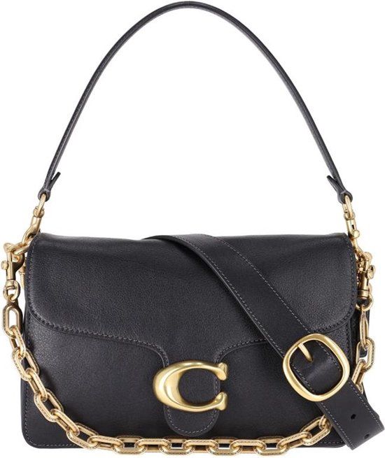 De chique Coach schoudertas uit de Tabby Chain collectie is een echte eyecatcher die je outfit naar een hoger niveau tilt. Deze luxueuze tas, uitgevoerd in het zwart, is voorzien van goudkleurig hardware en heeft het typische 'C' embleem van Coach aan de voorkant. Het soepele volnerf leer maakt dit model gemakkelijk en praktisch in gebruik.