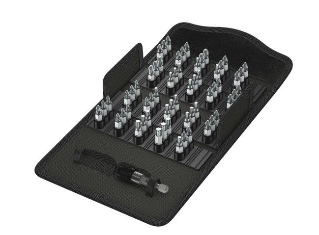 Robuust stoffen etui met bits voor houtbewerking, 61-delig. 1 universele houder 895/4/1 K met snelwisselfunctie en krachtige permanente magneet,\nvoor opname in de schroefmachine of in de boorkop van de elektronisch geregelde boormachine. Het stoffen etui kan de gebruiker gemakkelijk\nmeenemen en neemt weinig ruimte in beslag. Het voelbaar lagere gewicht van een set maakt het dragen een stuk aangenamer. Kwetsbare\noppervlakken worden bij het neerleggen van een etui niet beschadigd, terwijl dit stoffen etui toch sterk is. Mocht een etui met gereedschap een\nkeertje vallen, dan is dat geen enkel probleem.