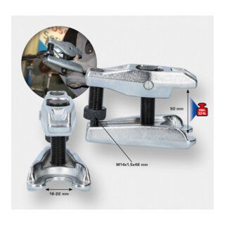 • De BRILLIANT TOOLS universele kogelgewrichtuitdrukker BT651017 is een zware, robuuste uitvoering en geproduceerd van gesmeed en gehard gereedschapstaal. Het gereedschap is geschikt voor alle gangbare voertuigtypen. De trekker heeft een groot spanbereik, tot maximaal 50 mm en is traploos in hoogte verstelbaar. Hiermee werkt u eenvoudig en zonder beschadigingen bij het uitdrukken van kogelkoppen bij het uitbouwen van de fusees of bij het uitdrukken van spoorstangkoppen.
