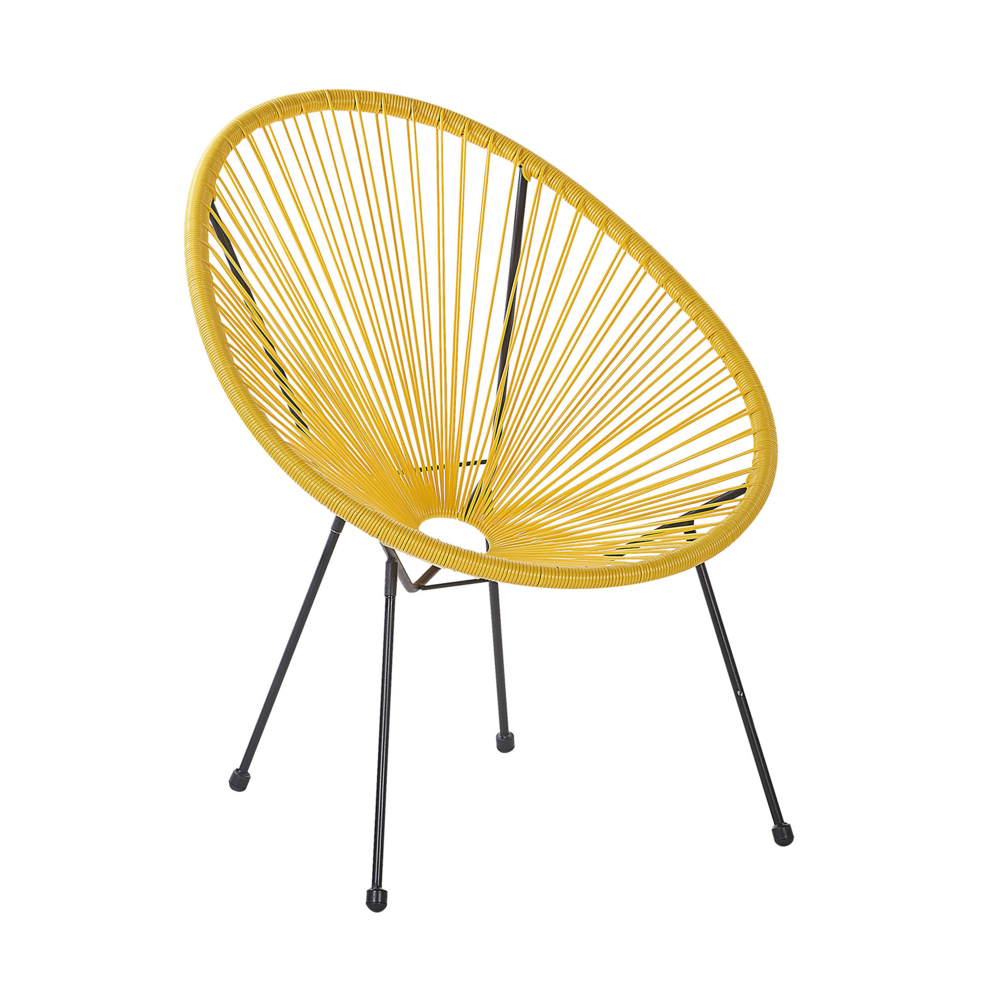 Trendy rotan-stoel in geel voor binnen en buiten. Deze fantastische stoel, beïnvloed door het klassieke Mexicaanse ontwerp, zal elke buitenplaats opfrissen. Het zitgedeelte is nauwkeurig gewoven. Het drie-benige frame, geconstrueerd van robuust staal, biedt totale stabiliteit. Deze stoel zal perfect zijn als een wicker meubel voor elk retroterras.Details: Producttype: Kuipstoel Stijl: Modern Kleur: Geel Soort materiaal: PE rotan Hoofdmateriaal: PE rotan Overig materiaal: Staal Material poten: Staal Materiaal zitting: Rotan Armleuning: Nee Afwerking: Gepoedercoat Opvouwbaar: Nee Stapelbaar: Nee Afmetingen: Diepte: 90 cm Hoogte zitting: 41 cm Breedte: 70 cm Hoogte: 87 cm Gewicht: 5 kg Draagvermogen: 160 kg Aanbod omvat: 1 x Stoel