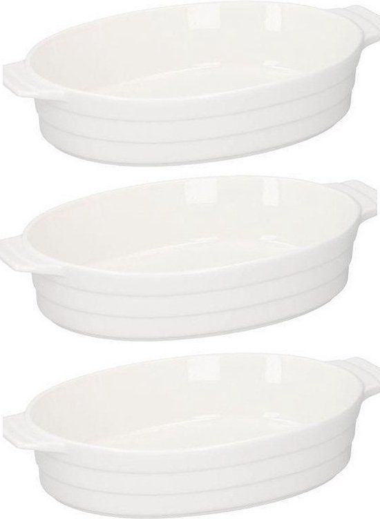 3x Witte ovenschalen ovaal. Deze ovale witte ovenschalen zijn gemaakt van keramiek en hebben een formaat van 31 x 18,5 cm. Handig voor bijvoorbeeld een ovenschotel, taart of quiche. Inhoud: 1500 ml. Geschikt tot max. 200 graden.
