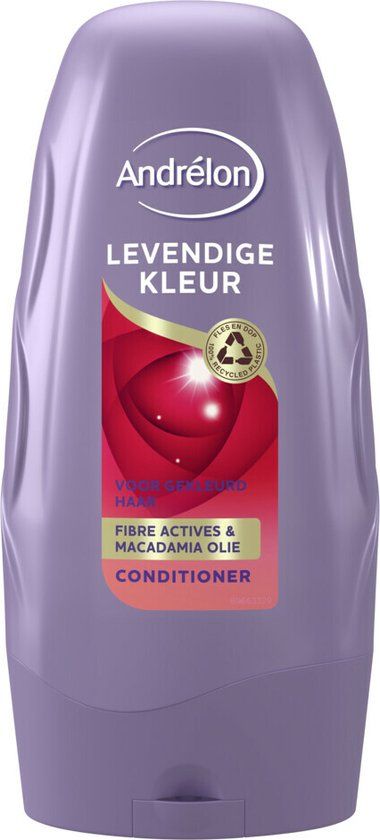 Andrélon Levendige Kleur Conditioner, verrijkt met macadamia olie en fibre actives, is speciaal ontwikkeld voor de optimale verzorging van gekleurd haar.