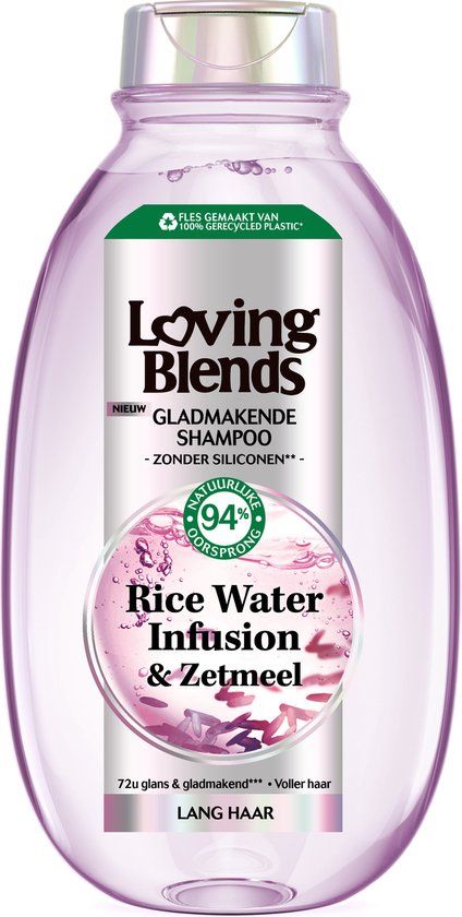 De Loving Blends Rice Water Infusion shampoo van Garnier is een shampoo van 94% natuurlijke oorsprong speciaal ontwikkeld voor lang haar. De shampoo resulteert in 72u glans & zachter haar*. De shampoo werkt als een remedie om lang haar voller te maken met hydratatie. De haarschubben zijn hersteld waardoor ze weer in staat zijn om licht te reflecteren. Ontdek de kracht van Rice Water & Zetmeel in deze unieke formule:- 72u glans*- Zachter haarFormule zonder siliconen, voor een natuurlijk gevoel en zonder ingrediënten of bijproducten van dierlijke oorsprong in een 100% gerecyclede en recyclebare fles. Loving Blends is gecertificeerd door Cruelty Free International.Ontdek voor nog meer verzorging ook de bijhorende conditioner & haarmasker. Ook geschikt voor verzachting en glans van het haar.*Instrumentele test