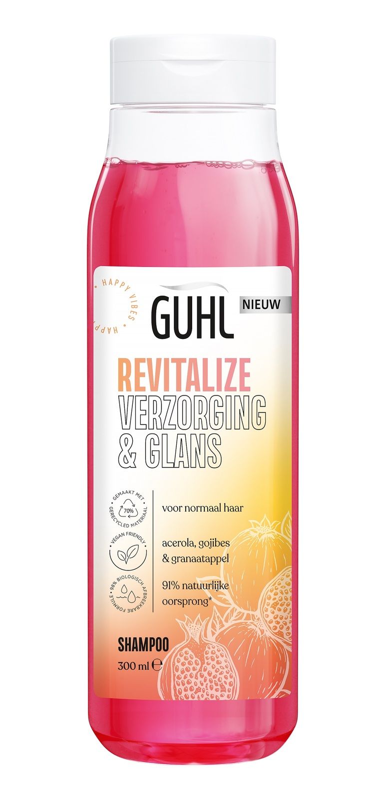 Guhl Revitalise Verzorging & Glans Shampoo bevat een effectieve formule die normaal haar versterkt en verzorgt zonder het te verzwaren. De diep reinigende shampoo verwijdert vuil en zorgt voor nieuwe energie en veerkracht en revitaliseert normaal haar direct. De shampoo bevat echte krachtpatsers uit de natuur zoals acerola, granaatappel en goji-bes en is volledig vrij van dierlijke producten.Guhl Revitalise Verzorging & Glans ShampooVersterkt en verzorgt het haar zonder te verzwarenMet acerola, gojibes en granaatappel91% natuurlijke oorsprong*. De overige 9% geeft een sensuele product ervaring en houdbaarheid van het product. *bevat waterGeeft souplesse en een stralende glansVoor veerkrachtig en gezond uitziend haarHoe te gebruiken?Inmasseren in nat haar en goed uitspoelen.