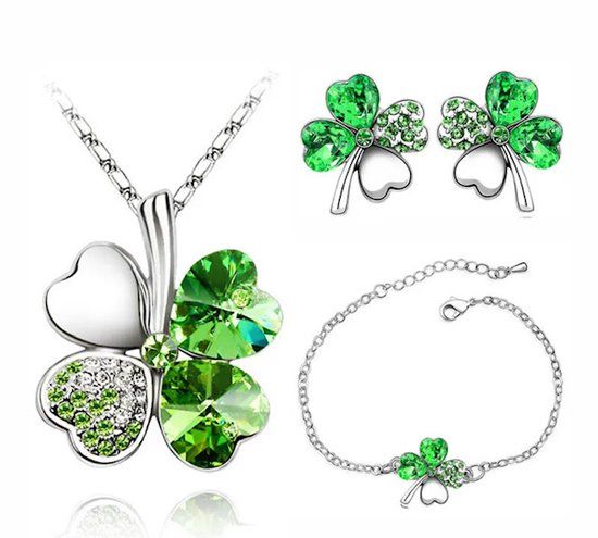 Soraro Klaver Zirkonia Set - Groen - 18K White Gold Plated - Ketting, Armband & Oorbel - Cadeauverpakking - Sieradensets