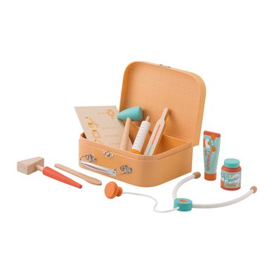 Product details: Leeftijd: vanaf 3 jaar Het perfecte rollenspel voor kleine dokters! Eerst moet je met de stethoscoop naar de hartslag luisteren en dan de temperatuur opnemen. Oh jee, koorts! Wat nu? Het beste is om de patiënt medicijnen of antibiotica voor te schrijven, zodat hij of zij zich snel beter zal voelen. Iemand heeft iets gebroken en een andere patiënt wacht al op zijn injectie: weer een volle dag in de spreekkamer van de dokter thuis! Hoge kwaliteit dokter speelset met stethoscoop, thermometer, injectiespuit en meer Stimuleert de verbeelding en creativiteit van uw kind Afmetingen en gewicht: Afmetingen in gemonteerde toestand (lengte x breedte x hoogte): 20 x 8 x 15 cm Gewicht: 0,48 kg Materiaal en verzorging: Materiaal: Hout Onderhoudsinstructies: Reinig het oppervlak met een vochtige doek. Gebruik geen alcohol of andere agressieve producten
