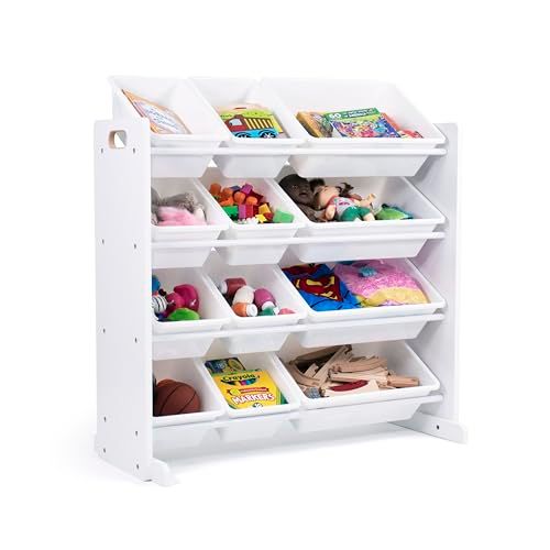 Uitneembare opbergbakken voor speelgoed om snel te kunnen spelen en makkelijk op te ruimen. Stevig frame van hout verstevigd met stalen deuvels, gewichtscapaciteit van 9 kg per plank. 12 duurzame kunststof opbergbakken, 8 standaard en 4 grote verwisselbare opbergbakken. BPA- en ftalaatvrij Productafmetingen - Opberger: W 86 cm x D 28 cm (D 40 cm met stabilisatiebeugels) x H 79 cm, bakken standaardformaat: L 30 cm x W 22 cm x 15 cm, bakken groot formaat: L 40 cm x W 12 cm x H 15 cm stabilisatiebeugels voor extra veiligheid en steun. Aan de wand te bevestigen voor veiligheid. Eenvoudig te monteren. Inclusief alle ijzerwaren.