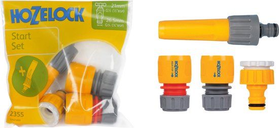 Een Hozelock vertstelbare tuinspuit inclusief aansluitmaterialen. Inclusief 1x slangstuk Ø 12,5 mm en 15 mm. Slangstuk is met waterstop. Tevens aanwezig in de set een kraanstuk tbv 3/4" en 1/2" kraanaansluiting.