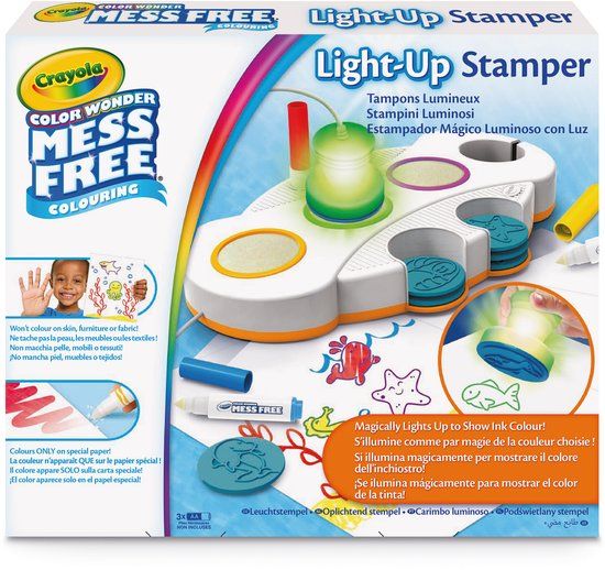 Met de lichtgevende stempelset kunnen kinderen met de 10 bijgeleverde stempels leuke creaties met een zeethema maken zonder te knoeien, want de inkt is transparant en verschijnt alleen op het speciale Color Wonder papier.