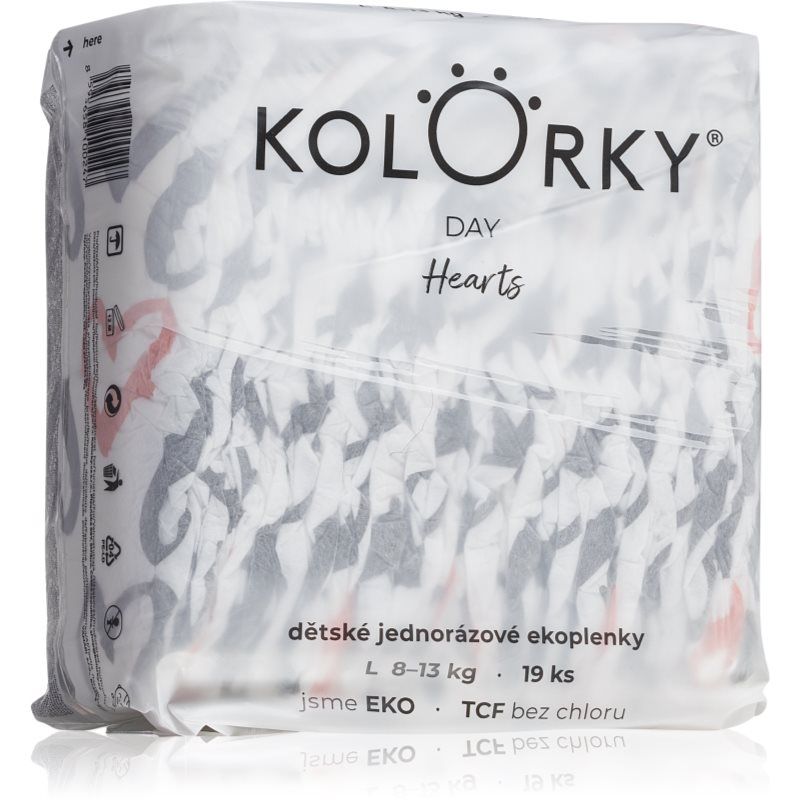 Kolorky Day Hearts, 19 st, ECO-luiers voor Kids, Vind je niet alleen het comfort van je baby, maar ook het milieu belangrijk? De ECO-luiers Kolorky Day Hearts geven je kindje een gevoel van comfort, laten de huid ademen en voorkomen lekken. Bovendien zijn ze gemaakt van ecologisch materiaal waardoor ze milieuvriendelijk zijn. Kenmerken: snelle absorptie voor een gevoel van droogheid voor maximaal comfort en tevredenheid van je kind niet gebleekt met chloor de vorm is aangepast een het lichaam van een kind dermatologisch getest – ook geschikt voor pasgeboren baby‘s en een gevoelige huid ECO Ingrediënten: milieuvriendelijk
