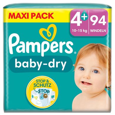 Productgegevens: Pampers Baby-Dry luiers, maat 4+, 10-15kg. Pampers Baby-Dry biedt tot 100% bescherming tegen doorlekken gedurende de hele nacht Dubbele veiligheidsmanchetten helpen lekkage rond de beentjes voorkomen De flexibele zijvleugels passen comfortabel rond het buikje van uw baby voor een goede pasvorm Pampers Baby-Dry luiers zijn dermatologisch getest en bevatten 0% EU-parfumallergenen (volgens EU Cosmeticaverordening nr. 1223/2009) Bij de levering inbegrepen: 94x Pampers Baby-Dry luiers, maat 4+, 10-15kg